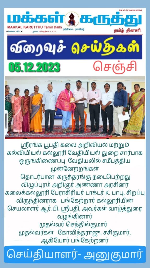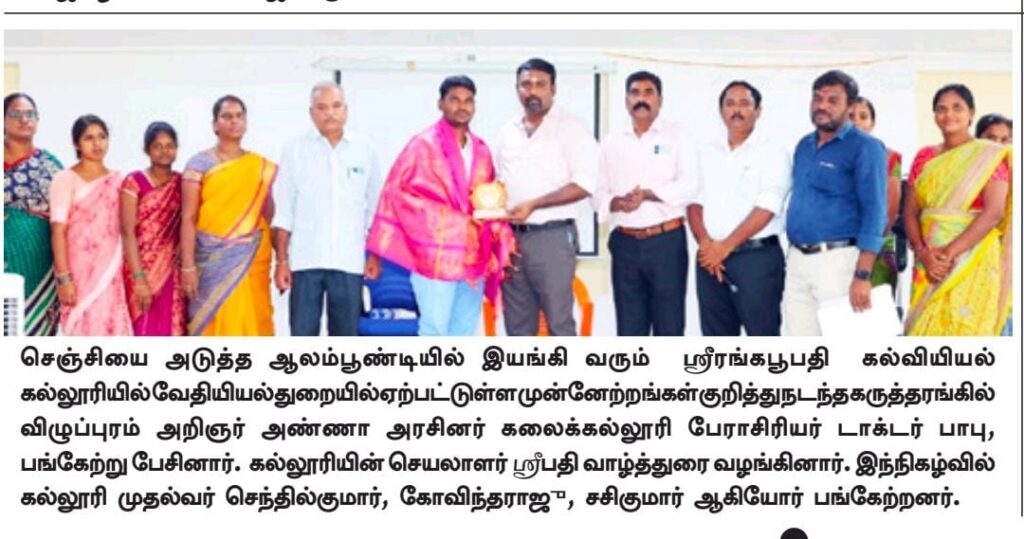 Sri Rangapoopathi Morning College of Science and Education organized a seminar on recent advances in coordination chemistry on behalf of the Department of Chemistry. Viluppuram Scholar Anna Government Arts College Professor Dr. k.Babu participated as special guest. R.P. Sripathy, secretary of the college, delivered the welcome address.